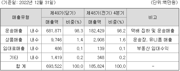 운송사업부는 소형화물운송을 주업으로 택배 집하하여 배송하는 서비스를 영위하고 있습니다.