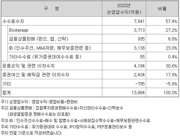 순영업수익은 ①수수료수지, ②운용손익 및 관련 이자수지, ③증권여신 및 예탁금 관련 이자수지, 기타로 분류되며, 순영업수익의 세부 구성은 아래와 같습니다.