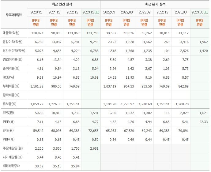 2022년 실적은 13조 4869억, 영업이익은 5781억입니다. 그리고 영업이익률은 4.29%입니다.