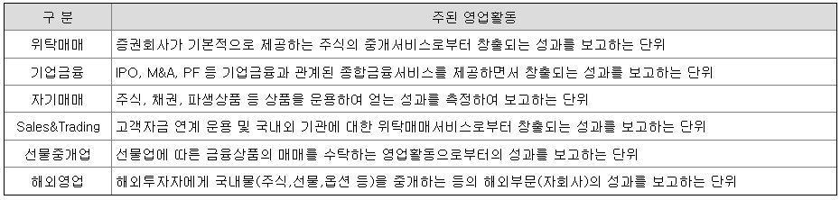 회사는 위탁매매, 기업금융, 자기매매, Sales&Trading, 선물중개업 그리고 해외영업의 6개영업부문으로 구성이 됩니다. 이러한 영업부문은 제공되는 상품과 서비스의 성격, 고객별 분류 및 회사의 조직을 기초로 나뉘어지며 주된 영업활동 내역은 다음과 같습니다.