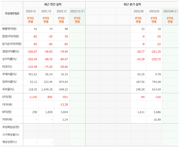 2022년 매출은 98억, 영업이익은 -78억, 당기순이익은 -82억입니다. 그리고 영업이익률은 -79.94%입니다.