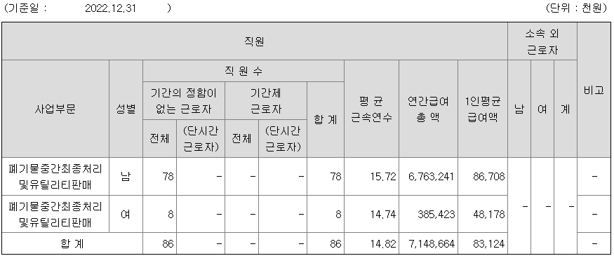 | 사업부문 | 성별 | 직원수 | 평균근속연수 | 평균연봉(백만) |