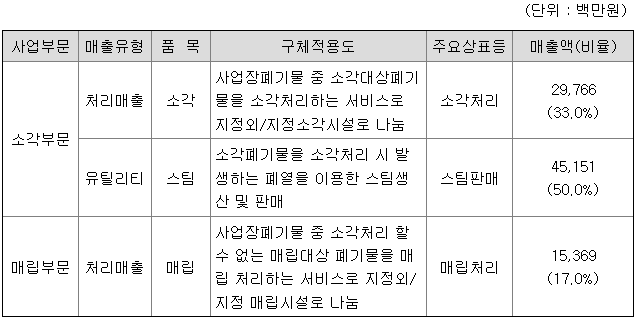 회사의 사업부문은 폐기물소각부문과 폐기물매립부문으로 구성되어 있습니다. 그 중 폐기물소각부문은 사업장폐기물 중 소각대상폐기물을 소각처리하는 서비스와 소각폐기물을 소각처리시 발생하는 폐열을 이용한 스팀생산 및 판매부문으로 구분되며, 사업장폐기물 중 소각처리 할 수 없는 매립대상 폐기물을 매립처리하는 서비스로 구성되어 있습니다.