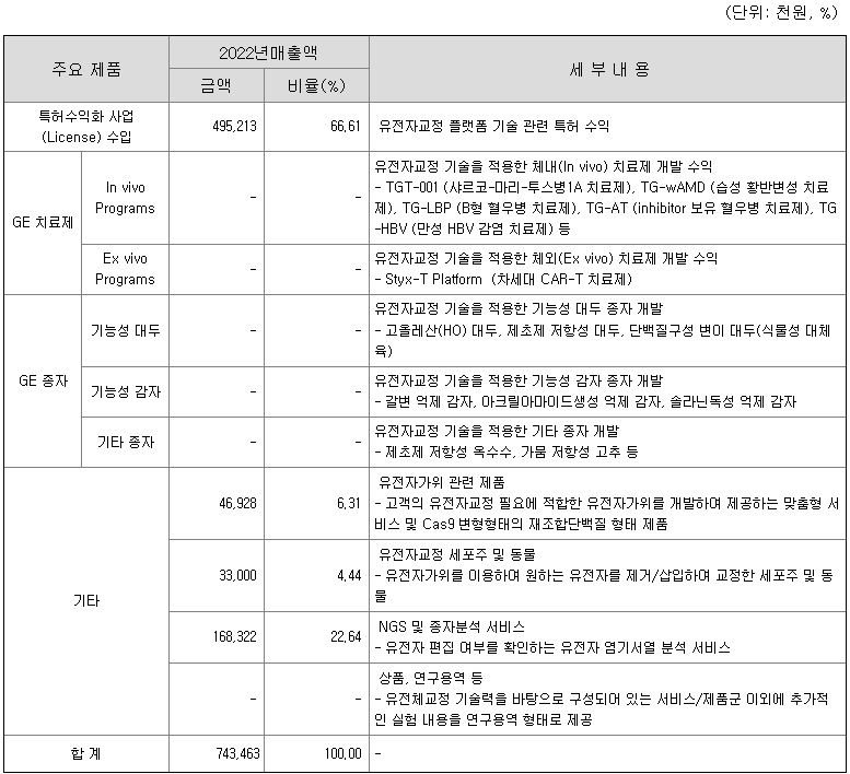 보고서 제출일 현재 당사는 유전자교정 연구개발 및 유전자교정 플랫폼 기술 기반 특허수익화 사업 및 치료제/동식물 제품 개발 등과 관련된 단일 사업부문을 영위하고 있으며, 유전자교정(유전자가위)기술을 이용하여 인류에게 질병 없는 건강한 삶, 동식물의 육종을 통한 풍족한 삶을 만들어가는 목표를 가지고 있습니다.