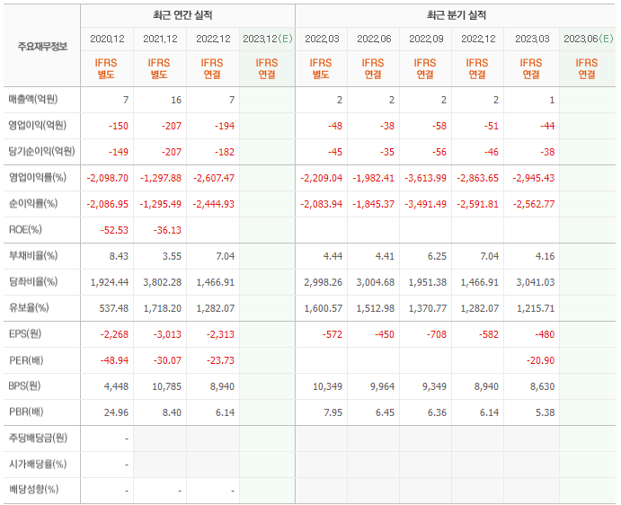 2022년 매출은 7억, 영업이익은 -194억, 당기순이익은 -182억입니다. 그리고 영업이익률은 -2607.47%입니다.