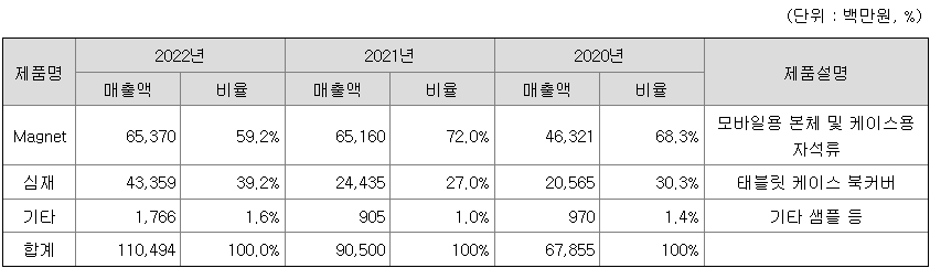 당사는 현재 희토류 금속계 자석 중 네오디움 자석(Nd-Fe-B)을 이용한 시장에 주력하고 있으며, 특히 스마트폰, 태블릿PC 등 고품질의 사양이 요구되는 스마트 디바이스에 적합한 설계, 솔루션을 제공하고 있습니다. 주요 제품은 다음과 같습니다.