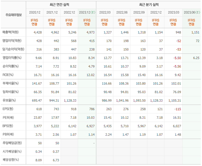2022년 매출은 5246억, 영업이익은 568억, 당기순이익은 447억입니다. 그리고 영업이익률은 10.83%입니다.