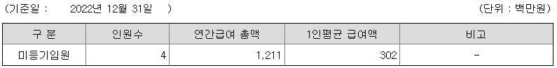 미등기임원의 평균연봉은 3억 200만원이고 직원수는 4명입니다.