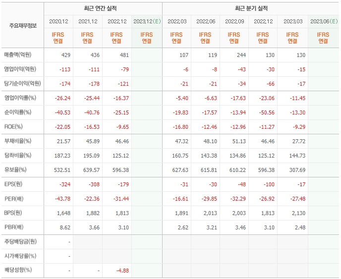 2022년 매출은 481억, 영업이익은 -79억, 당기순이익은 -121억입니다. 그리고 영업이익률은 -16.37%입니다.
