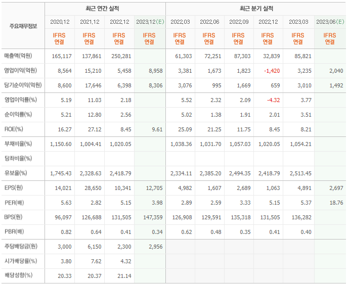 2022년 실적은 25조 281억, 영업이익은 5458억입니다. 그리고 영업이익률은 2.18%입니다.