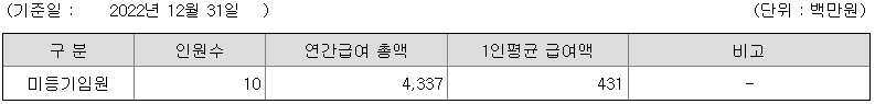 미등기임원의 평균연봉은 4억 3100만원이고 직원수는 10명입니다.