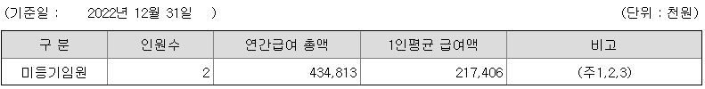 미등기임원의 평균연봉은 2억 1700만원이고 직원수는 2명입니다.