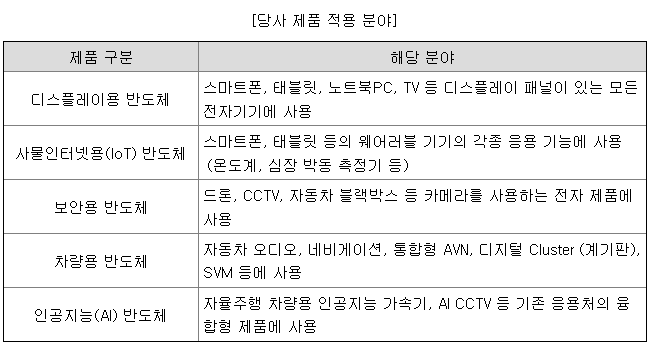 당사의 주 사업 부문인 시스템 반도체 파운드리 디자인솔루션은 스마트폰, 태블릿, 노트북PC, TV, 키오스크 등의 디스플레이 기능이 필요한 일반 가전제품에서부터 스마트폰, 태블릿 등의 웨어러블 기기의 각종 응용제품(체온계, 심장 박동 측정기 등)에 적용되며, 드론, 산업용/보안용 CCTV, 자동차 블랙박스 등의 카메라 기능을 활용한 각종 기기는 물론 자동차의 오디오, 비디오, 네비게이션, 통합 AVN, 디지털 계기판 (Cluster), ADAS, SVM 등에 이르기까지 거의 모든 전자 제품 및 기기에 사용되고 있습니다. 또한 최근 개발을 시작한 당사의 인공지능(AI) 반도체는 단독으로 특정 응용처에 국한되기 보다는 기존 응용처에 융합되어 자율주행 차량용 인공지능 (AI) 가속기, 인공지능 (AI) CCTV 등의 다양한 기기에 사용되고 있습니다.
