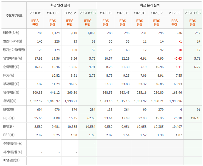 2022년 매출은 1110억, 영업이익은 93억, 당기순이익은 150억입니다. 그리고 영업이익률은 8.34%입니다.