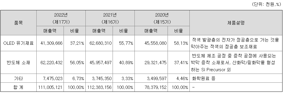 당사의 주요사업은 Display用 화학제품인 OLED소재(OLED발광재료 중간체), 2차전지 소재, 합성고무用 소재(타이어 고무 합성 소재), 기타 전자재료 소재의 유,무기 합성을 전문으로하는 Fine Chemical 부문과 반도체용 증착소재(Precursor) 및 합성수지용 고분자 촉매 등 전자재료 소재의 유,무기 합성을 전문으로 하는 반도체 부문을 영위하고 있습니다.