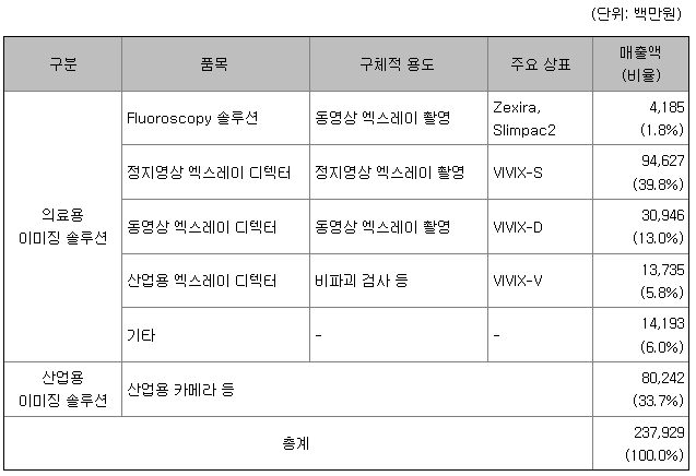 연결회사는 엑스레이 디텍터(detector)와 산업용 카메라 등 이미징 솔루션을 개발, 제조, 판매합니다. 주요 품목으로는 정지영상 엑스레이 디텍터와 치과용 등의 다양한 동영상 엑스레이 디텍터, 그리고 산업용 엑스레이 디텍터 및 산업용 카메라 등이 있습니다.