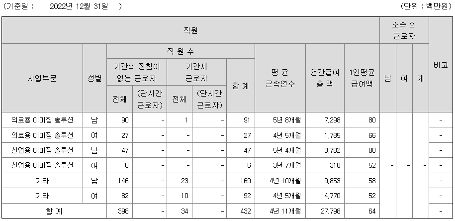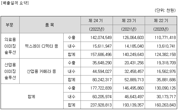 연결회사는 2022년 연결기준 237,929백만원의 매출 실적을 달성하였고, 영업이익은 43,658백만원이었습니다. 가격 경쟁력이 우수한 제품을 바탕으로 정지영상 엑스레이 디텍터는 견조한 실적 흐름을 보였습니다. COVID-19로 성장이 둔화되었던 치과용 동영상 디텍터는 중국 등 일부 시장을 중심으로 지난해부터 높은 성장율을 보이고 있습니다. 산업용카메라는 FPD(Flat Panel Display) 검사 설비 투자 회복과 골프 시장 호황에 힘입어 폭발적인 매출 성장을 기록했습니다. 뿐만 아니라, 반도체, PCB(Printed Circuit Board) 등 전자 부품, 문서 검사 등 다양한 응용 분야에서 고루 성장하며 전년 동기 대비 매출이 큰 폭으로 증가하였습니다.