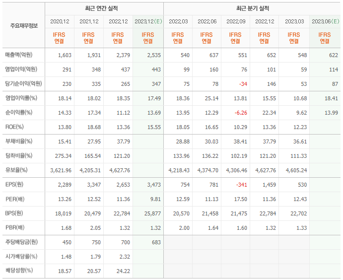 2022년 매출은 2379억, 영업이익은 437억, 당기순이익은 265억입니다. 그리고 영업이익률은 18.35%입니다.