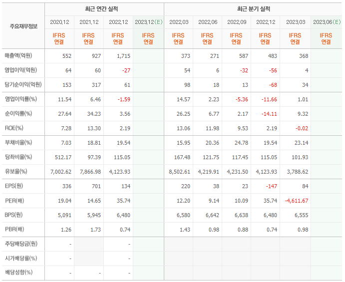 2022년 매출은 1715억, 영업이익은 -27억, 당기순이익은 61억입니다. 그리고 영업이익률은 -1.59%입니다.