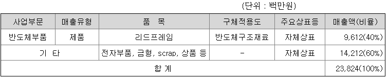 당사는 반도체부품인 리드프레임 제조회사로서, 총매출액에서 차지하는 비율은 아래와 같습니다.