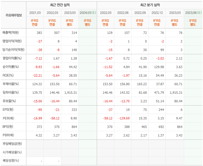 2022년 매출은 314억, 영업이익은 4억, 당기순이익은 140억입니다. 그리고 영업이익률은 1.28%입니다.