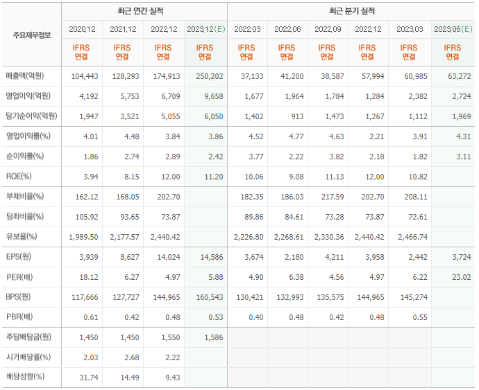 2022년 실적은 17조 4913억, 영업이익은 6709억입니다. 그리고 영업이익률은 3.84%입니다.