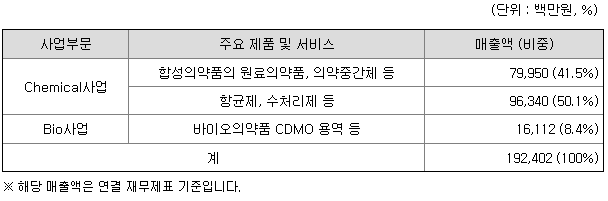 당사의 Chemical사업본부에서는 신약 및 제네릭 합성의약품의 원제인 원료의약품 및 의약중간체와 세균증식을 억제하는 항균제, 환경정화를 위한 수처리제 등의 기능성 소재 제품을 생산, 판매하고 있습니다. Bio사업본부에서는 바이오의약품의 기술수출 및 CDMO(위탁개발ㆍ생산) 등의 용역을 제공하고 있습니다. 공시대상기간 동안의 제품ㆍ서비스별 매출액 및 비중은 다음과 같습니다.