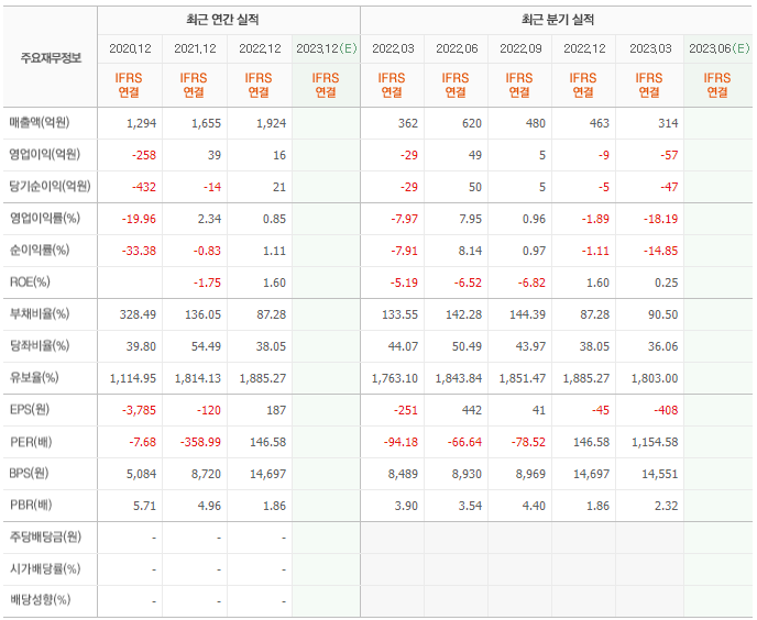 2022년 매출은 1924억, 영업이익은 16억, 당기순이익은 21억입니다. 그리고 영업이익률은 0.85%입니다.