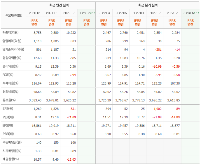 2022년 매출은 1조 232억, 영업이익은 803억, 당기순이익은 31억입니다. 그리고 영업이익률은 7.85%입니다.