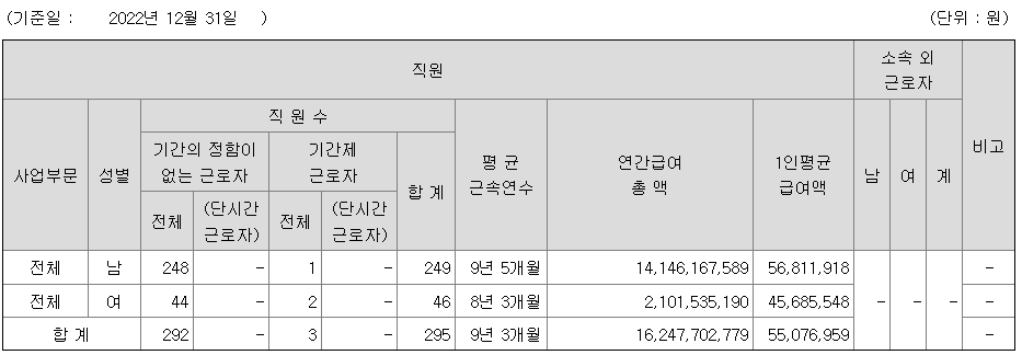 남성의 평균연봉은 5600만원이고 직원수는 249명, 여성은 4500만원이고 직원수는 46명입니다. 전체 평균연봉은 5500만원이고 직원수는 295명입니다.