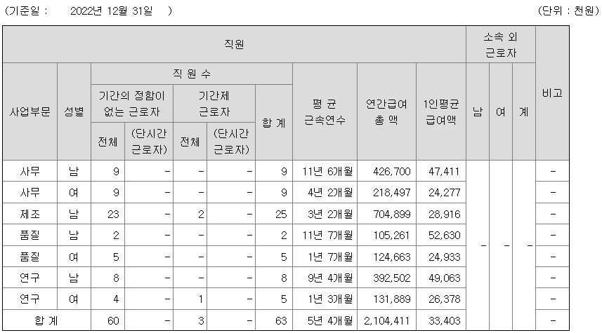 | 사업부문 | 성별 | 직원수 | 평균근속연수 | 평균연봉(백만) |