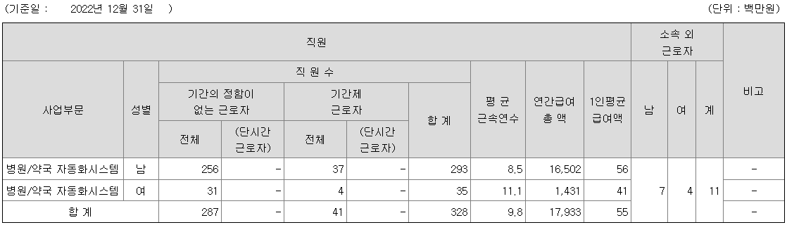 | 사업부문 | 성별 | 직원수 | 평균근속연수 | 평균연봉(백만) |