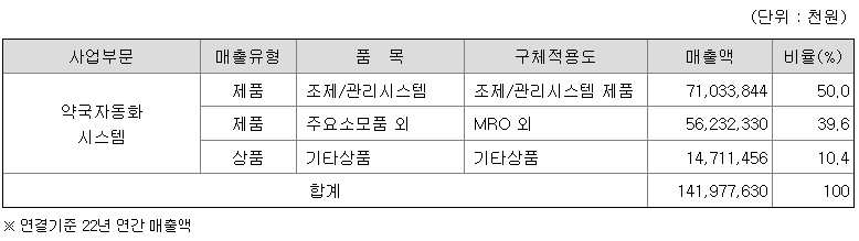 당사의 사업부문은 약국 조제/관리 자동화 시스템 제조이며, 한국 표준산업분류표 세세분류의 C29192 (용기세척, 포장 및 충전기 제조업)으로 구분됩니다.