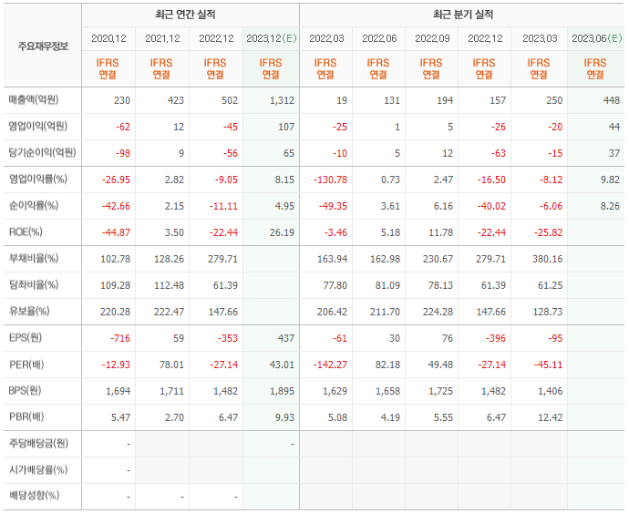 2022년 매출은 502억, 영업이익은 -45억, 당기순이익은 -56억입니다. 그리고 영업이익률은 -9.05%입니다.