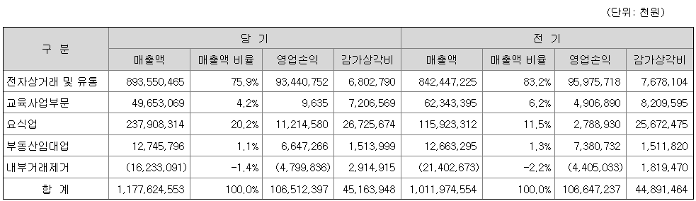 당기와 전기 중 부문별 손익은 다음과 같습니다.