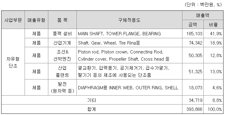 단조사업부는 풍력, 조선, 발전(원자력), 플랜트(시멘트, 화공, 해양), 산업기계 등의 산업군을 영위 하고 있으며, 금형을 사용할 수 없는 규격이 크고 표준화되지 않은 제품을 주문생산 방식으로 생산/공급하고 있습니다.