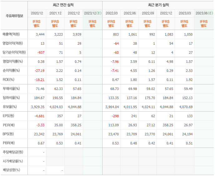 2022년 매출은 3939억, 영업이익은 29억, 당기순이익은 5억입니다. 그리고 영업이익률은 0.74%입니다.