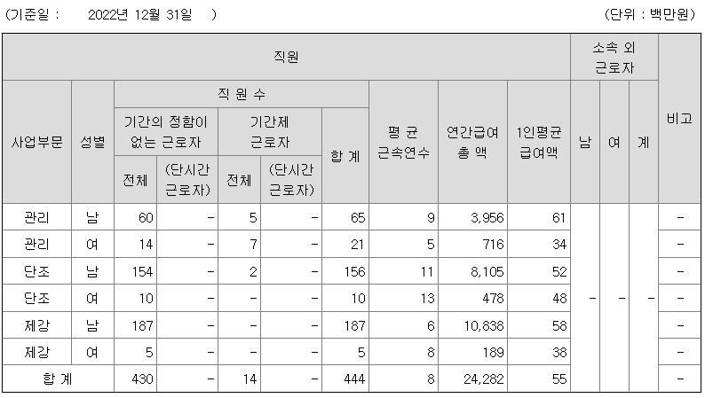 | 사업부문 | 성별 | 직원수 | 평균근속연수 | 평균연봉(백만) |