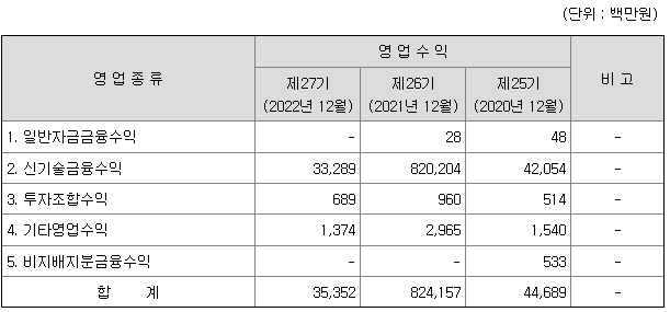 이후 여신금융부문이 점차 안정을 찾아가며 회수에 전념하였고, 기존의 전문분야인 신기술금융투자부문에 역량을 집중해, 2013년 흑자 전환 이후 지속적인 성장율을 보이고 있습니다. 2018년에 234억원 규모의 우리타이러스 글로벌 핀테크 투자조합 13호의 결성을 시작으로 꾸준히 신기술투자조합을 결성 운영하고 있으며, 2021년에는 투자주식 회수 및 신기술금융자산 평가익 증가로 인해 당기순이익 6,194억으로 괄목할만한 성과를 보였습니다.