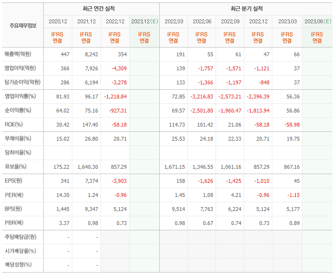 2022년 매출은 354억, 영업이익은 -4309억, 당기순이익은 -3278억입니다. 그리고 영업이익률은 -1218.84%입니다.