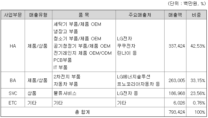 세탁기, 건조기, 냉장고, 청소기 등 생활가전 부품을 생산하고 있으며, 고객사로부터 기술력을 인정받아 프리미엄 핸디형 청소기 및 로봇청소기 등을 OEM 생산하고 있습니다. 기존 부품사업의 원가절감 및 OEM/ODM 비중확대를 통해 수익성 극대화에 노력하고 있습니다.