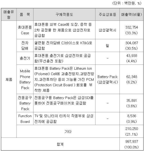 연결회사는 배터리팩, 휴대폰용 Case, 충전기 등 제품을 생산하여 삼성전자 및 삼성SDI에 공급하고 있습니다. 삼성전자 및 삼성SDI로의 매출이 전체의 67% 내외를 차지하며, 케이티앤지로의 매출액이 30%내외를 차지합니다. 제품별 매출액 및 매출비중은 다음과 같습니다.
