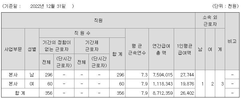 | 사업부문 | 성별 | 직원수 | 평균근속연수 | 평균연봉(백만) |