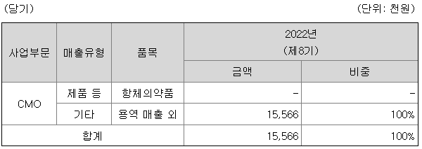 보고서 작성 기준일 현재 국내외 제약회사의 첨단 바이오의약품을 위탁 생산하며,의약품개발 과정에 참여하여 개발단계별 맞춤형 서비스를 제공함으로써 다양한 형태의고객과 협력체계를 구축합니다. 또한, Easy to modify/Adapt 시스템을 도입하여 고객 Needs에 맞는 제조 환경을 제공하는 CDEMO (Contract Development, Engineering & Manufacturing Organization) 사업을 영위하고 있습니다.