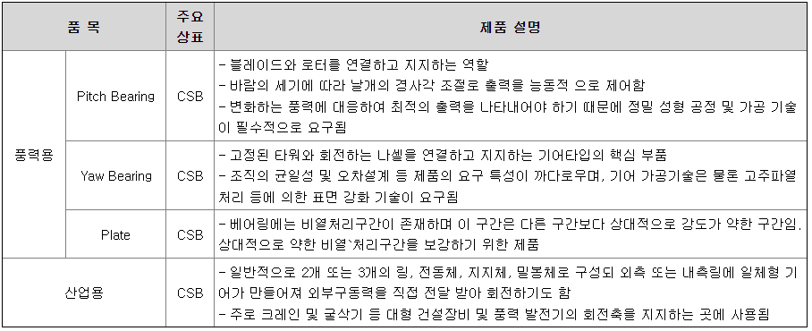 당사의 주요사업은 풍력용 베어링 제조입니다. 블레이드와 로터를 연결하고 지지하는 역할을 하는 피치 베어링과 수평축 풍력 발전기의 요 시스템 중 중요한 요소 중 하나인 요 베어링을 주력 제품으로 생산하고 있습니다. 설립 당시부터 풍력발전기용 선회베어링 제조를 목표로 설립되었고, 모든 구성 설비와 제조 공정이 풍력발전기용 선회베어링 제조에 최적화되어 있습니다.