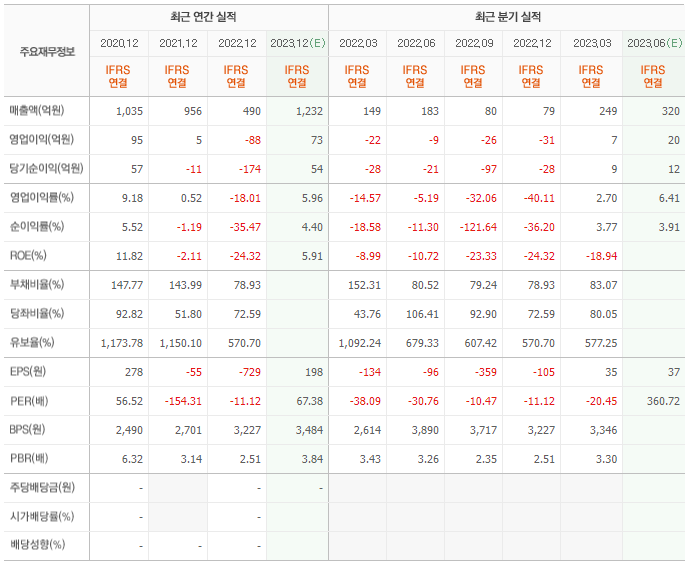 2022년 매출은 490억, 영업이익은 -88억, 당기순이익은 -174억입니다. 그리고 영업이익률은 -18.01%입니다.