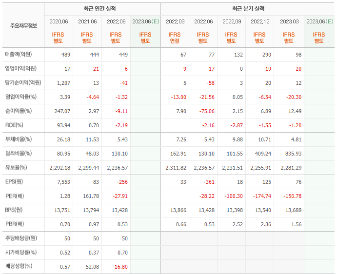 2022년 매출은 449억, 영업이익은 -6억, 당기순이익은 -41억입니다. 그리고 영업이익률은 -1.32%입니다.