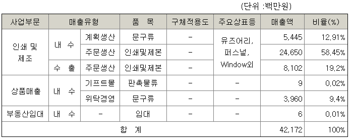 당사는 설립 이후 수첩 및 다이어리제품 등을 전문생산하는 동종업계  최대의 업체이며, 제품생산에 있어서는 주문생산방식과 계획생산방식으로 그 비율은 7:3정도이며 주문생산방식에서도 수출이 약 25% 이상 차지하고 있어 자금회전력이 상당히 양호합니다. 금번 제44기 반기 당사의 매출실적은 전년 동기 대비 38% 증가한 42,172백만원을 달성하였습니다. 그 세부내역을 보면 수출은 8,102백만원 달성, 전년동기대비 34.7% 증가하였고, 내수매출(법인영업, 시판영업, 기타사업)은 전년 동기 대비 38.8% 증가한 34,070백만원을 기록하였습니다.