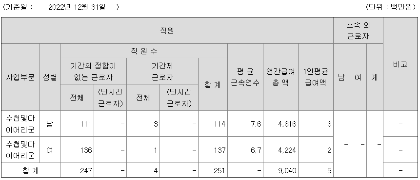 사업부문 성별 직원수 평균근속연수 평균연봉(백만)