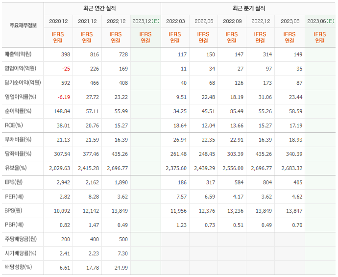 2022년 매출은 728억, 영업이익은 169억, 당기순이익은 408억입니다. 그리고 영업이익률은 23.22%입니다.